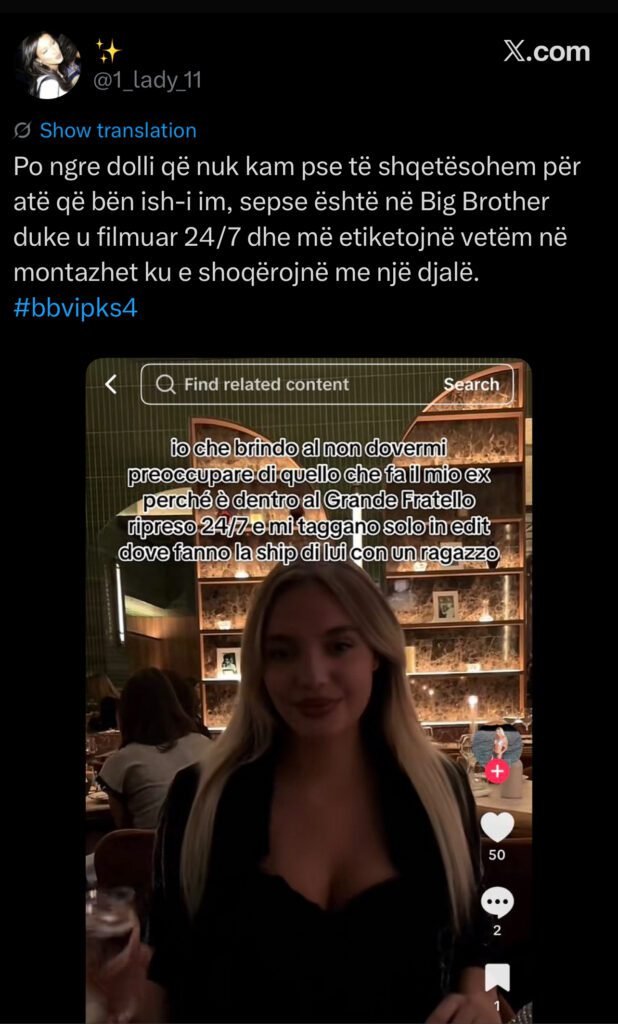 Po ngre dolli që s’kam pse të shqetësohem për atë që bën ish-i im, sepse është në Big Brother duke u filmuar 24/7… dhe më etiketojnë vetëm në montazhet ku e shoqërojnë me një djalë.”